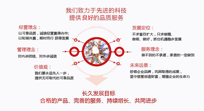 我们坚信只有不断创新的企业才能在新的竞争环境中立于不败之地,我们经营活动都应创造经济效益;我们的所作为都应产生积极的影响;我们将开诚布公的处理各种关系,并对自己的行为负责。